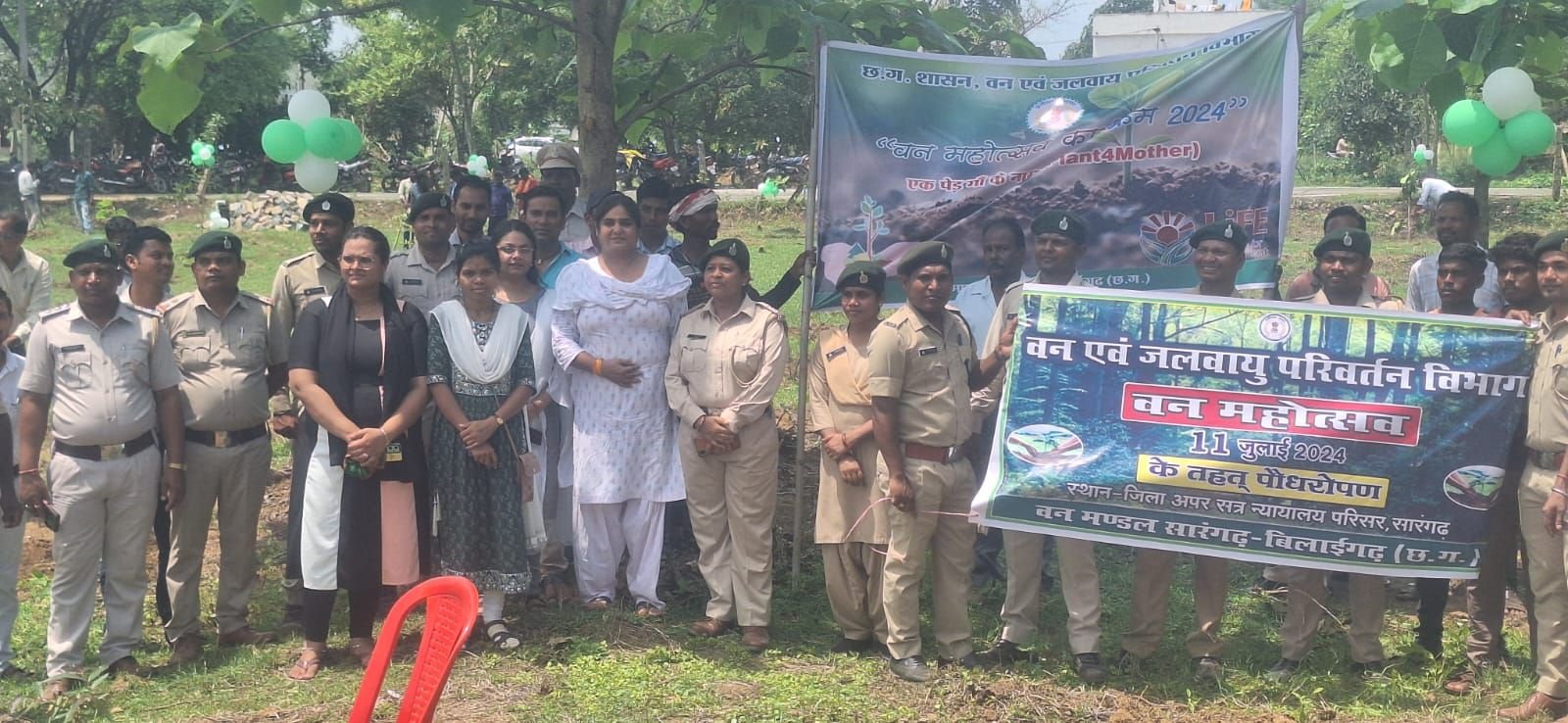 सारंगढ़ बिलाईगढ़, आम जनों को पौधारोपण कर पर्यावरण संरक्षण का संदेश देने वन विभाग के बैनर तले वन महोत्सव 2024 एक पेड़ मां के नाम कार्यक्रम जिला एवम सत्र न्यायालय परिसर सारंगढ़ में आयोजित किया गया। इस कार्यक्रम में अपर जिला सत्र न्यायाधीश द्वय राधिका सैनी, अमित राठौर, कलेक्टर धर्मेश साहू, पुलिस अधीक्षक पुष्कर शर्मा, प्रथम व्यवहार न्यायाधीश वर्ग 1 पारुल श्रीवास्तव, प्रथम व्यवहार न्यायाधीश वर्ग 2 अभिनव डहरिया, द्वितीय व्यवहार न्यायाधीश वर्ग 1 शीलू सिंह, द्वितीय व्यवहार न्यायाधीश वर्ग 2 ध्रुवराज ग्वाल, डीएफओ पुष्पलता टंडन, परियोजना निदेशक हरिशंकर चौहान के साथ जिला स्तरीय अधिकारियों ने न्यायालय परिसर पर पौधे लगाए।