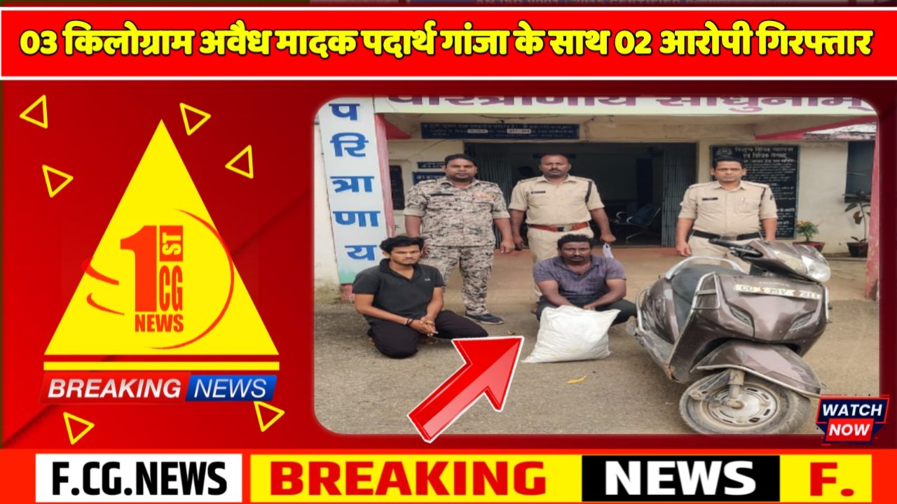 मामले का संक्षिप्त विवरण जिला सारंगढ़-बिलाईगढ़ के पुलिस अधीक्षक महोदय सारंगढ़-बिलाईगढ़ (श्री पुष्कर शर्मा) के द्वारा जिले के सभी थाना/चौकी प्रभारियों को जुआ, सट्टा, शराब, अवैध मादक पदार्थ गाजा में संलिप्त व्यक्तियों के उपर कड़ी से कड़ी कार्यवाही करने निर्देशित किया गया है। इसी कड़ी में श्रीमान पुलिस अधीक्षक महोदय के निर्देशन में तथा श्रीमान् अति० पुलिस अधीक्षक महोदय सारंगढ़-बिलाईगढ़ (श्री कमलेश्वर प्रसाद चंदेल) एवं श्रीमान् उप पुलिस अधीक्षक महोदय सारंगढ़ (श्री अविनाश मिश्रा) के कुशल मार्गदर्शन में दिनांक 25.10.2024 को मुखबीर की सुचना पर 03 किलोग्राम अवैध मादक पदार्थ गांजा के साथ 02 आरोपीयों को गिरफ्तार करने में सफलता हासिल हुई है।