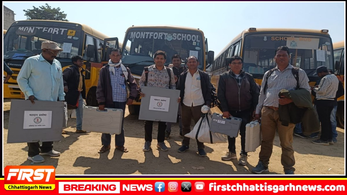 मतदान सामग्री प्राप्त कर मतदान दल कड़ी सुरक्षा के साथ पोलिंग बूथ के लिए रवाना