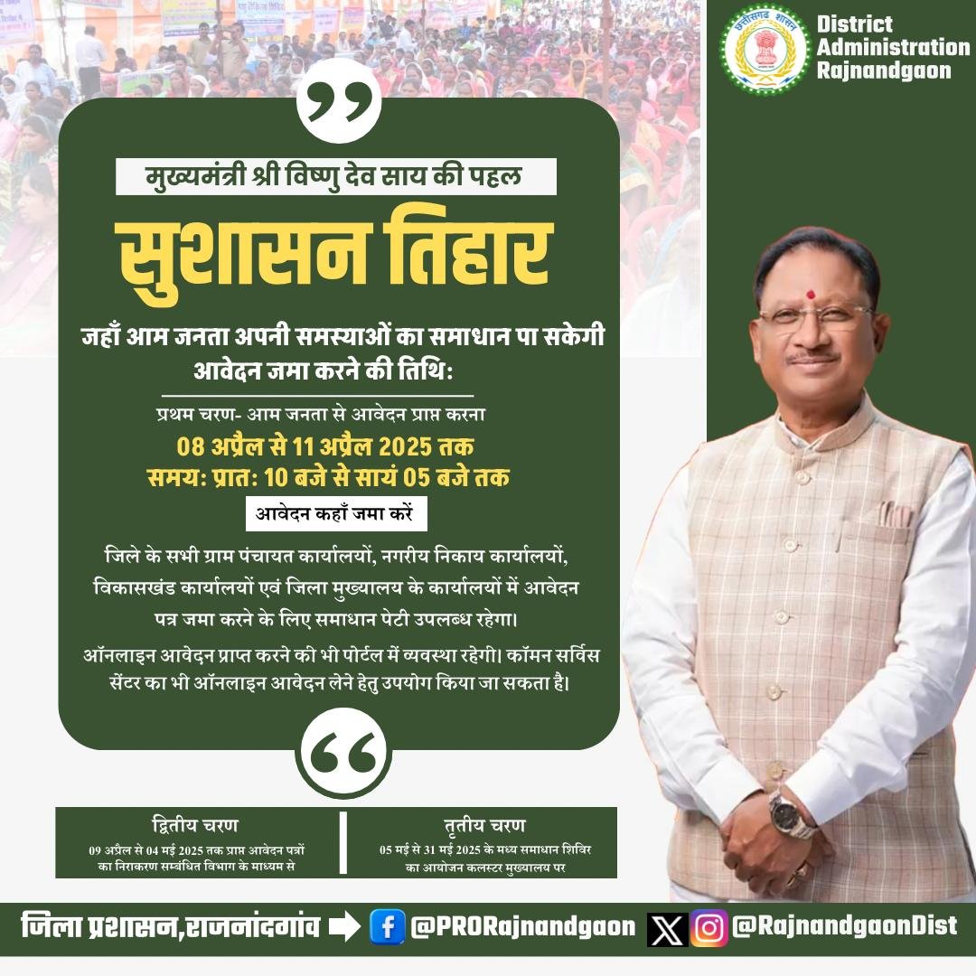 कलेक्टर श्री संजय अग्रवाल ने कहा कि दूसरे चरण में लगभग एक माह के भीतर प्राप्त आवेदनों के निराकरण किया जाएगा तथा तीसरे चरण एवं अंतिम चरण 5 मई से 31 मई 2025 तक कल्स्टर में समाधान शिविरों का आयोजन किया जाएगा और  एसएमएस के माध्यम से आवेदक को शिविर के संबंध में जानकारी प्रदान की जाएगी। आवेदकों के आवेदन समाधान पेटी में रखें जाएंगे। उन्होंने कहा कि निर्धारित समय में सभी अधिकारी ड्यूटी पर उपस्थित रहे। हर वार्ड एवं ग्राम पंचायतों में सुशासन तिहार के संबंध में जानकारी देने के लिए मुनादी कराएं तथा दीवार लेखन कराने के निर्देश दिए। हर ग्राम पंचायत में कम्प्यूटर में आवेदन की प्रविष्टि कराएं। मांग एवं शिकायत से संबंधित आवेदनों को पृथक करें तथा शिकायत संबंधी आवेदनों का यथाशीघ्र निराकरण करना सुनिश्चित करें। मांग से संबंधित आवेदनों में शासन की योजना के अंतर्गत नियमों का पालन करते हुए अनुशंसा के साथ प्रस्ताव एवं पत्र भेज सकते है। सुशासन तिहार में जनप्रतिनिधियों की भागीदारी होनी चाहिए। उन्होंने इस दौरान आवेदन देने के लिए आने वाले बुजुर्गों एवं अन्य नागरिकों के लिए के बैठने के लिए व्यवस्था करने के लिए कहा। जिला पंचायत सीईओ सुश्री सुरूचि सिंह ने कहा कि सुशासन तिहार के संबंध में जानकारी देने के लिए ग्रामीण क्षेत्रों में मुनादी एवं दीवार लेखन का कार्य कराने के साथ ही फलैक्स भी लगाएं। ग्राम पंचायतों में आवेदन लेने के बाद समाधान पेटी में क्रमांक भी होना चाहिए। इस अवसर पर अपर कलेक्टर श्री सीएल मारकण्डेय, नगर निगम आयुक्त अतुल विश्वकर्मा, एसडीएम राजनांदगांव श्री खेमलाल वर्मा एवं अन्य अधिकारी उपस्थित रहे।