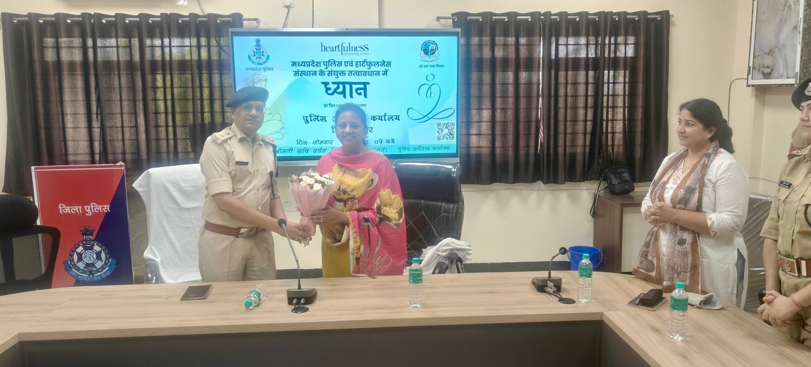 सर्वप्रथम पुलिस अधीक्षक मैहर श्री सुधीर अग्रवाल के द्वारा पुष्प गुच्छ भेंट कर आईजी प्रशासन श्रीमति रूचि वर्धन मिश्रा का अभिवादन किया गया। तत्पश्चात श्रीमति रूचि वर्धन मिश्रा द्वारा हार्टफुलनेस ध्यान के संबंध में जानकारी देते हुए बताया गया कि हार्टफुलनेस ध्यान तकनीक कई तरह के फायदे प्रदान करती है। यह तनाव कम करने, ध्यान केंद्रित करने, और भावनात्मक संतुलन को बेहतर बनाने में मदद करती है. इससे मन शांत और प्रसन्न होता है,
