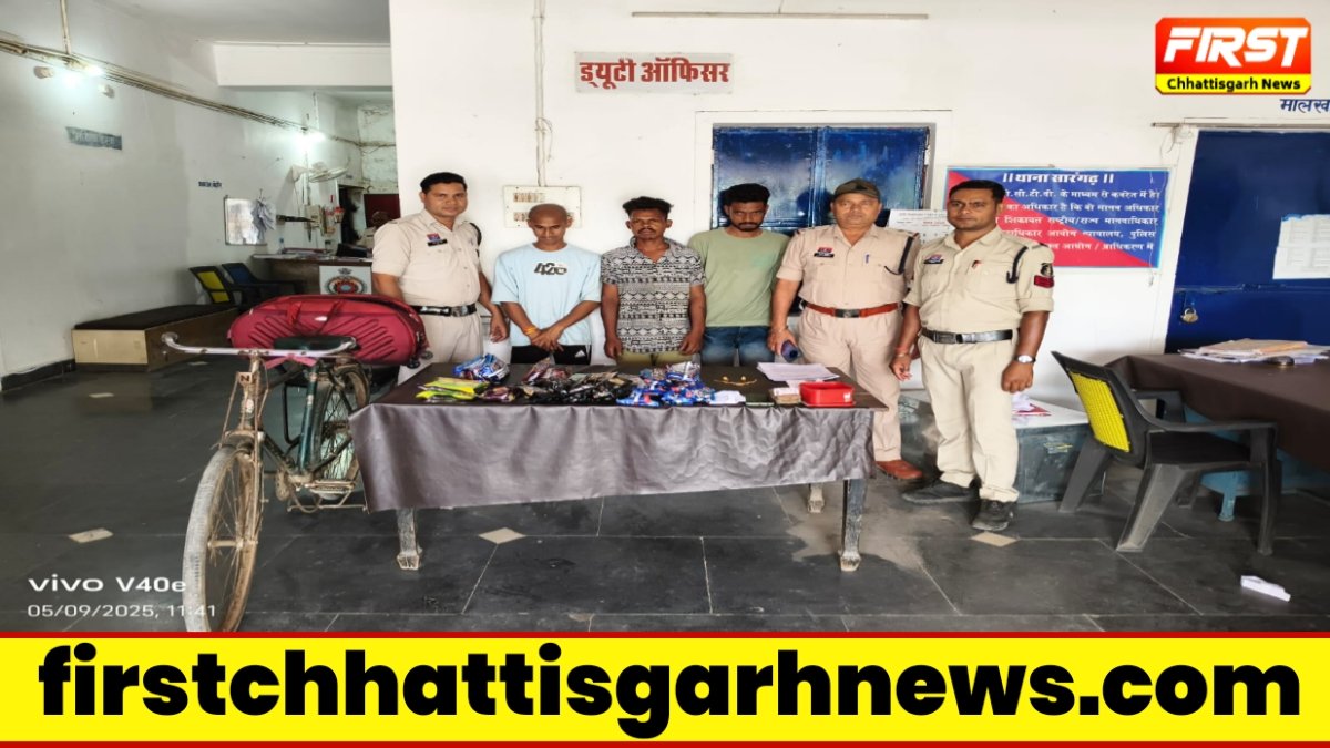 श्रीमान पुलिस अधीक्षक महोदय श्री आंजनेय वार्ष्णेय, अति0 पुलिस अधीक्षक श्रीमती निमिषा पाण्डेय एवं एसडीओपी श्रीमति स्नेहिल साहू के द्वारा चोरी की घटनाओं  पर रोकथाम हेतु लगातार निर्देशित किये जाने पर थाना प्रभारी कोतवाली कामिल हक के  कुशल मार्ग दर्शन में थाना सिटी कोतवाली सारंगढ़ के पुलिस स्टाफ के द्वारा थाना क्षेत्रअंतर्गत विभिन्न स्थानों मे चोरी किये गए आरोपियों क़ो पकड़ने मे सफलता प्राप्त हुई कि (1.)दिनांक 12.04.2025 क़ो साराडीह निवासी हेमसागर सादावर्ती के दुकान से नगदी रकम व राजश्री, पान बाहर, सिगरेट व अन्य वस्तु,