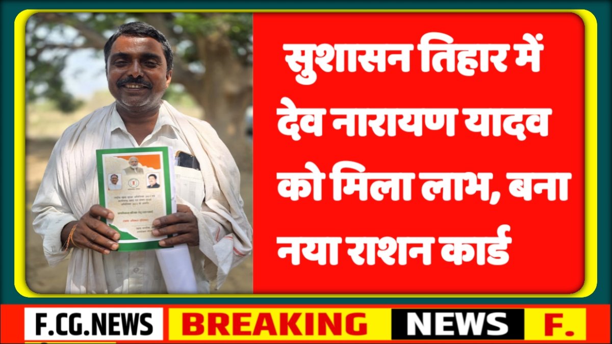 श्री देव नारायण यादव लंबे समय से राशनकार्ड के अभाव में शासकीय खाद्यान्न योजना का लाभ नहीं ले पा रहे थे। उन्होंने सुशासन तिहार के दौरान अपनी मांग को लेकर सुशासन तिहार में आवेदन दिया। जिला प्रशासन ने मामले में त्वरित संज्ञान लेते हुए उनकी पात्रता की पुष्टि की और नया राशन कार्ड बनाकर प्रदान किया।