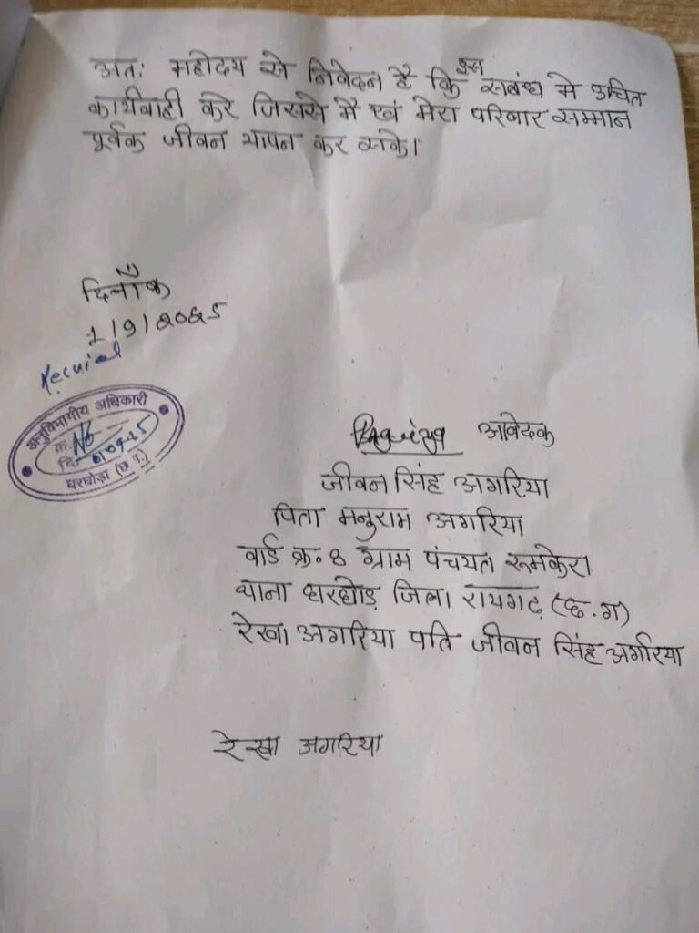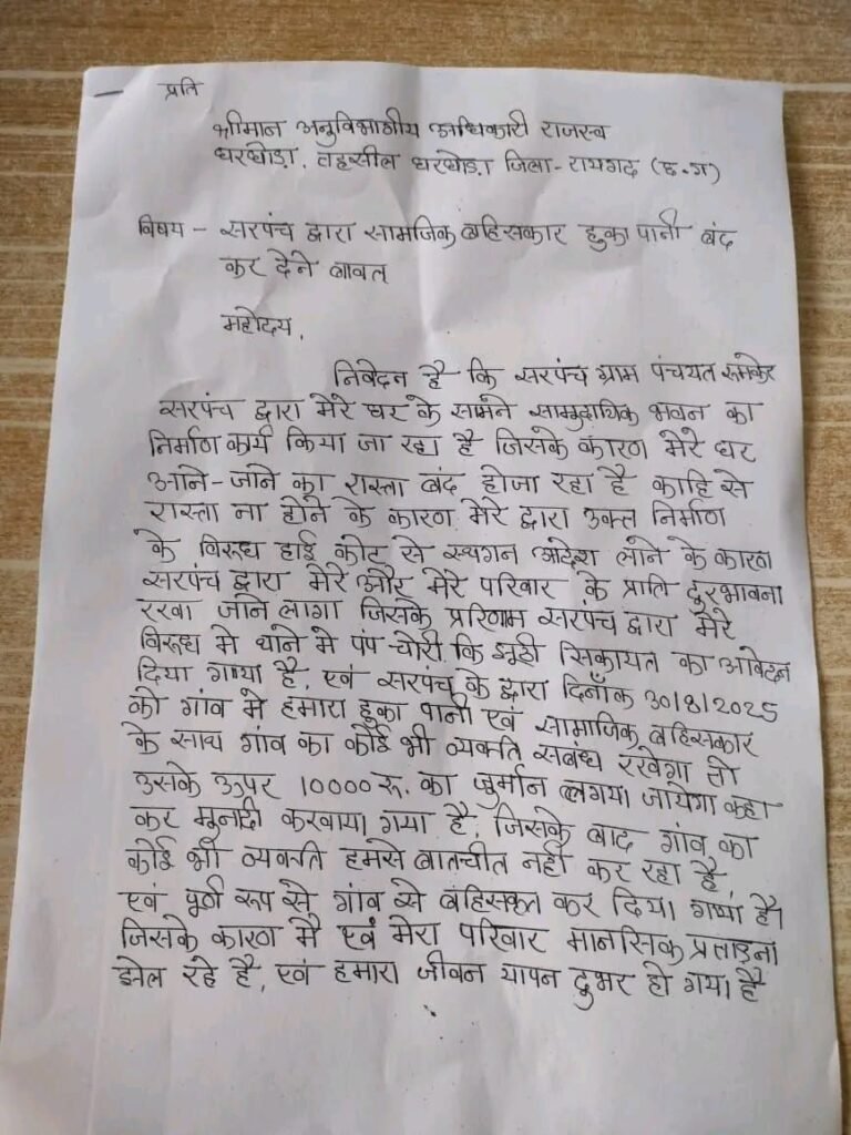 एवं सरपंच के द्वारा दिनांक 30/8/2025 को गांव में हमारा हुका पानी एवं सामाजिक बहिसकार के साथ गांव का कोई भी व्यक्ति सबंध रखेगा फोर उसके ऊपर 10000 रु. का जुर्मान लगाया जायेगा कहा कर मुनादी करवाया गया है, जिसके बाद गांव का कोई भी आदमी हमसे बातचीत नहीं कर रहा है, एवं पूर्ण रूप से गांव से बंहिसकृत कर दिया गया है। जिसके कारण में एवं मेरा परिवार मानसिक प्रताड़ना झेल रहे है, एवं हमारा जीवन यापन दूभर हो गया है। अतः महोदय से निवेदन है कि सबंध में उचित कार्यवाही करे जिससे में एवं मेरा परिवार सम्मान पूर्वक जीवन यापन कर सकें।