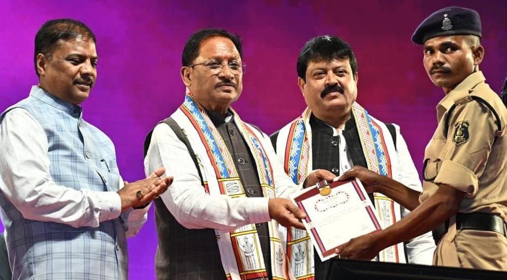 मुख्यमंत्री श्री विष्णु देव साय ने नक्सल ऑपरेशन में अदम्य साहस और वीरता का प्रदर्शन करने वाले पुलिस के 14 जवानों को वीरता पदक प्रदान कर सम्मानित किया। उन्होंने शहीद अतिरिक्त पुलिस अधीक्षक श्री आकाश राव गिरिपुंजे और शहीद वीरेंद्र कुमार शोरी के परिजनों सहित नक्सल मोर्चे पर जांबाजी के साथ लड़ने वाले पुलिस जवानों श्री धरम सिंह तुलावी, श्री विजय पुनेंग, श्री गोपाल बरदू, श्री रामेश्वर ओयामी, श्री राजूलाल मरकाम, श्री समलूराम सेठिया, श्री तुलाराम ओवासी, श्री मोहन लाल कट्टम, श्री संतोष मोरामी, श्री मनोज यादव, श्री जामुराव तथा सुश्री निशा कचलाम को वीरता पदक प्रदान कर सम्मानित किया।