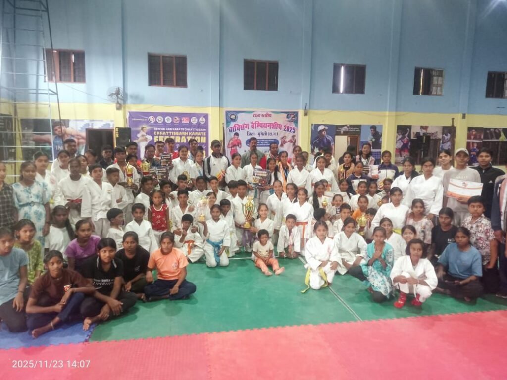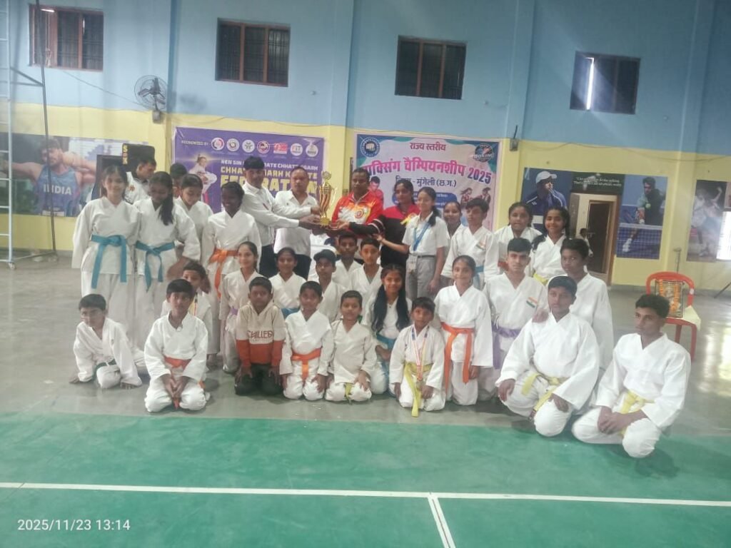 जिला मुंगेली मुख्यालय स्थित श्यामा प्रसाद मुखर्जी स्टेडियम में दो दिवसीय खेलो छत्तीसगढ़ यूथ कराते गेम्स–2025 का सफल और अत्यंत उत्साहपूर्ण आयोजन सम्पन्न हुआ। इस महत्वपूर्ण आयोजन का संचालन रेन सिन कान कराटे छत्तीसगढ़ द्वारा किया गया तथा सह-आयोजक के रूप में वर्सेटाइल शोतोकान एसोसिएशन छत्तीसगढ़ की सक्रिय और प्रभावशाली भूमिका रही। आयोजक सेंसई श्री रमाकांत मिश्रा जी ने जानकारी देते हुए बताया प्रतियोगिता में राज्य के 23 जिलों से आए लगभग 300 से अधिक खिलाड़ियों ने भाग लिया और अपने उत्कृष्ट कौशल, अनुशासन तथा खेल–भावना का अद्भुत प्रदर्शन किया। इस प्रतियोगिता में विजेता टीमों ने उल्लेखनीय प्रदर्शन करते हुए अपनी-अपनी श्रेणी में प्रतिष्ठित स्थान अर्जित किए, जिनमें प्रथम स्थान पर जांजगीर–चांपा की टीम रही। जांजगीर जिले की टीम ने प्रशिक्षक अखिलेश आदित्य,अमृता शर्मा और योगिता शर्मा के नेतृत्व में श्रेष्ठ तकनीक और शानदार संघर्ष का परिचय देते हुए प्रथम टीम ट्रॉफी अपने नाम की।