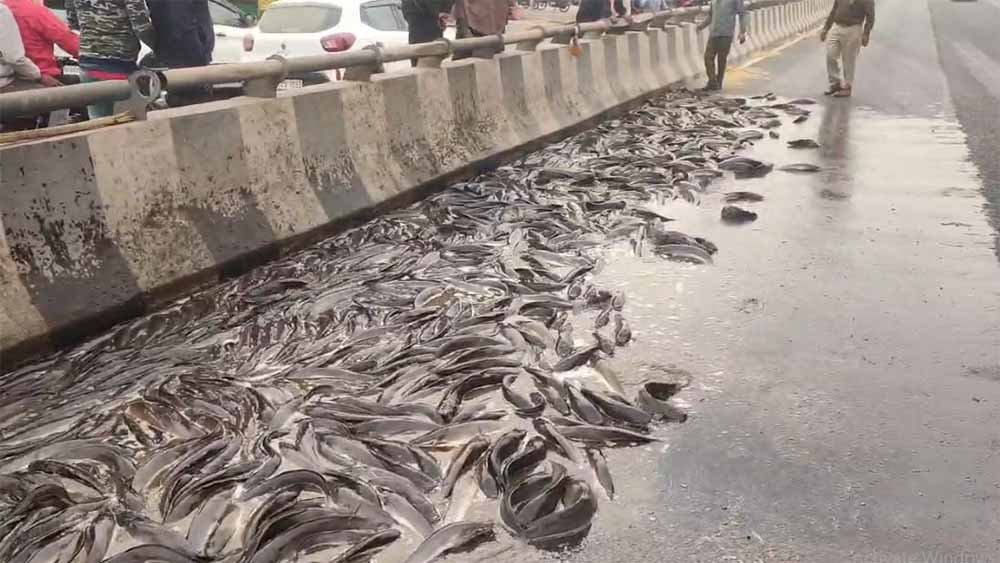 सोनीपत में सड़क पर बिखरी मछलियाँ! कैंटर पलटा, मौके पर भीड़ और घंटों जाम