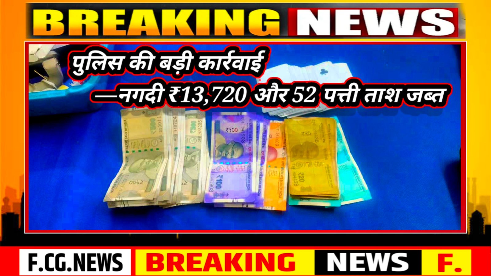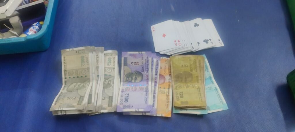 मौके से नगदी ₹13,720 और 52 पत्ती ताश बरामद किए गए।