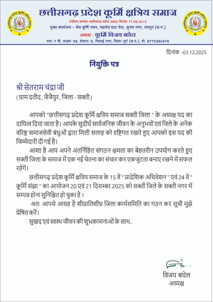 सक्ती-प्रदेश कूर्मि क्षत्रिय समाज के प्रदेश अध्यक्ष सांसद  विजय बघेल ने पूर्व सहायक विकासखंड शिक्षा अधिकारी एवं तहसील पेंशनर संघ के अध्यक्ष तथा समाज सेवी दतौद,निवासी श्री सेतराम चंद्रा को छत्तीसगढ़ प्रदेश कूर्मि क्षत्रिय समाज सक्ती जिला के अध्यक्ष पद का दायित्व दिया जाता है। आपके सुदीर्घ सार्वजनिक जीवन के अनुभवों एवं जिले के अनेक वरिष्ठ समाजसेवी बंधुओं द्वारा मिली सलाह को दृष्टिगत रखते हुए आपको इस पद की जिम्मेदारी दी गई है।
