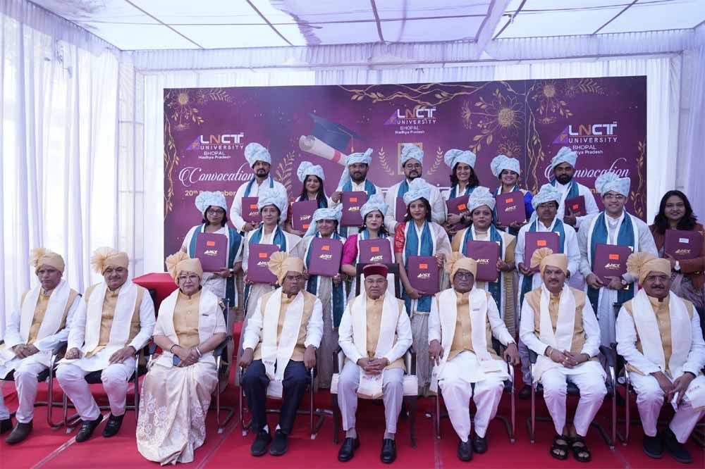 मध्य प्रदेश की राजधानी भोपाल में शनिवार, 20 दिसंबर को शिक्षा और गौरव का उत्सव देखने को मिला। कोलार रोड स्थित एलएनसीटी यूनिवर्सिटी में चौथे दीक्षांत समारोह का भव्य आयोजन किया गया, जहां छात्र-छात्राओं के सपनों को नई उड़ान मिली। दीक्षांत समारोह में कर्नाटक राज्य के राज्यपाल थवारचंद गहलोत मुख्य अतिथि के रूप में मौजूद रहे। कार्यक्रम की गरिमा को बढ़ाने के लिए केंद्रीय मंत्री फग्गन सिंह कुलस्ते और भाजपा राष्ट्रीय महा सचिव अरुण सिंह भी बतौर विशेष अतिथि मौजूद रहे। मध्य प्रदेश शासन में राज्य मंत्री कृष्णा गौर, भोपाल की हुजूर विधानसभा से विधायक रामेश्वर शर्मा, एमपी प्राइवेट यूनिवर्सिटी रेगुलेटरी कमिशन के प्रेसिडेंट डॉ खेम सिंह डहरिया भी मौजूद रहे। कार्यक्रम में अंडरग्रैजुएट और पोस्ट ग्रेजुएट समेत 835 और एचडी के 29 छात्र छात्राओं ने डिग्री प्राप्त की। वहीं 34 गोल्ड मैडल और 1 मेमोरल मेडल भी दिया गया।