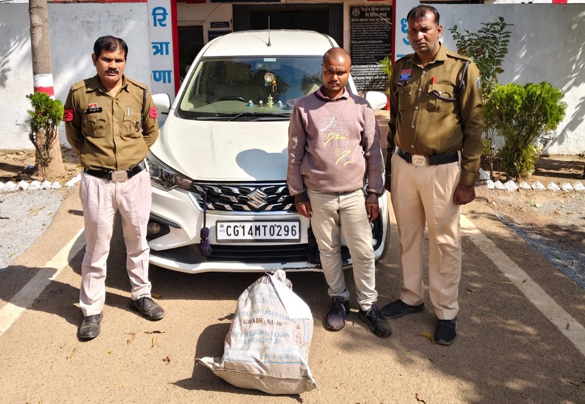 विवरण इस प्रकार है कि दिनांक 09/01/2026को दौरान पेट्रोलिंग जरिये मुखबीर सुचना मिला एक  सफेद रंग के आर्टिगा कार क्रमांक CG 14 MT 0296 का चालक उड़ीसा से गांजा लेकर सरिया तरफ जा रहा है सूचना पर सरिया थाना के सामने मेन रोड में  घेराबंदी कर आर्टिगा कार क्रमांक  CG14 MT 0296को पकड़ा गया। कार चालक से नाम पता पूछने पर अपना नाम मुकेश यादव पिता सोमेश्वर यादव उम्र 23 वर्ष सा भट्ठीकोना थाना बगीचा जिला जशपुर का होना बताया। गवाहों के समक्ष आर्टिगा कार की तलाशी लेने पर कार के पीछे डिक्की मे सफेद रंग के प्लास्टिक बोरी में भरा 10 पैकेट में 10 किलो 270  ग्राम अवैध मादक पदार्थ गांजा मिला। आरोपी से पूछताछ करने पर जिला सोनपुर उड़ीसा से गांजा लेकर बगीचा जिला जशपुर बिक्री हेतु ले जाना बताया कि आरोपी मुकेश यादव पिता सोमेश्वर यादव उम्र 23 वर्ष सा भट्ठीकोना थाना बगीचा जिला जशपुर के कब्जे से 10किलो 270 ग्राम अवैध मादक पदार्थ गांजा, 01नग आर्टिगा कार क्रमांक CG 14 MT 0296, 01 नग NARZO कंपनी के मोबाइल को जप्त कर आरोपी के खिलाफ थाना सरिया मे अपराध क्रमांक 09/2026 धारा 20 बी एनडीपीएस एक्ट पंजीबद्ध कर आरोपी को विधिवत् गिरफ्तार कर न्यायिक रिमांड पर जेल भेजा गया है।
