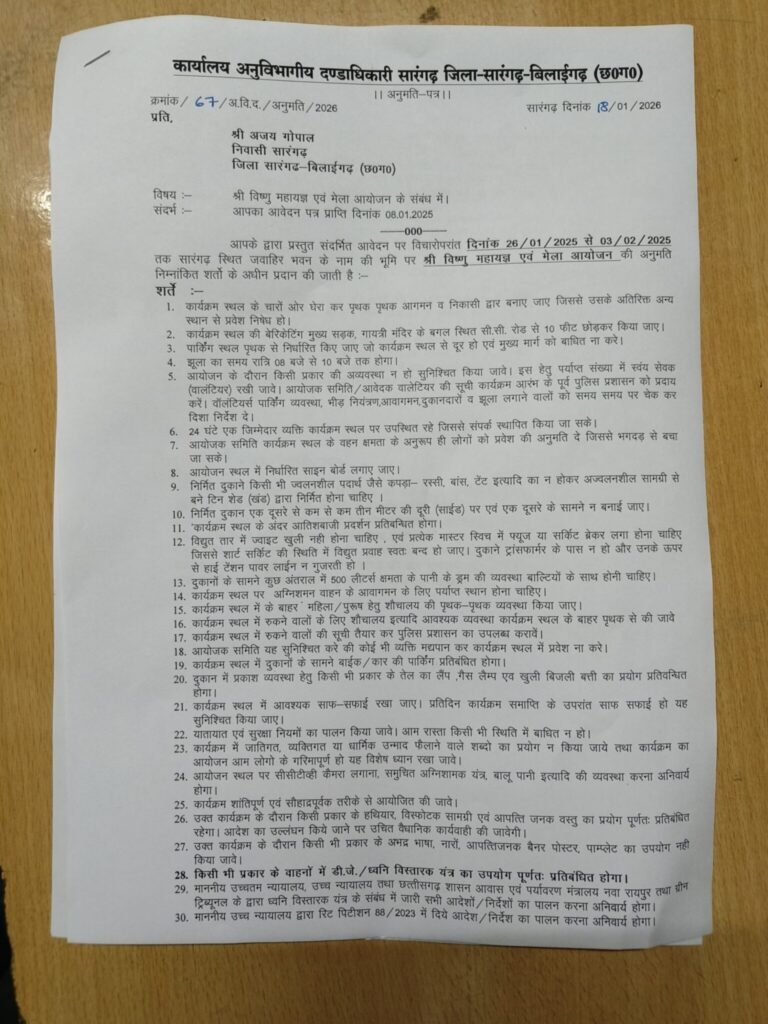 एसडीएम सारंगढ़ वर्षा बंसल ने मेला आयोजन को 40 बिंदुओं की शर्तों के साथ सशर्त अनुमति प्रदान की है। प्रशासन से अनुमति मिलने के बाद आयोजन समिति ने सारंगढ़ बंद के आह्वान को निरस्त कर दिया है।