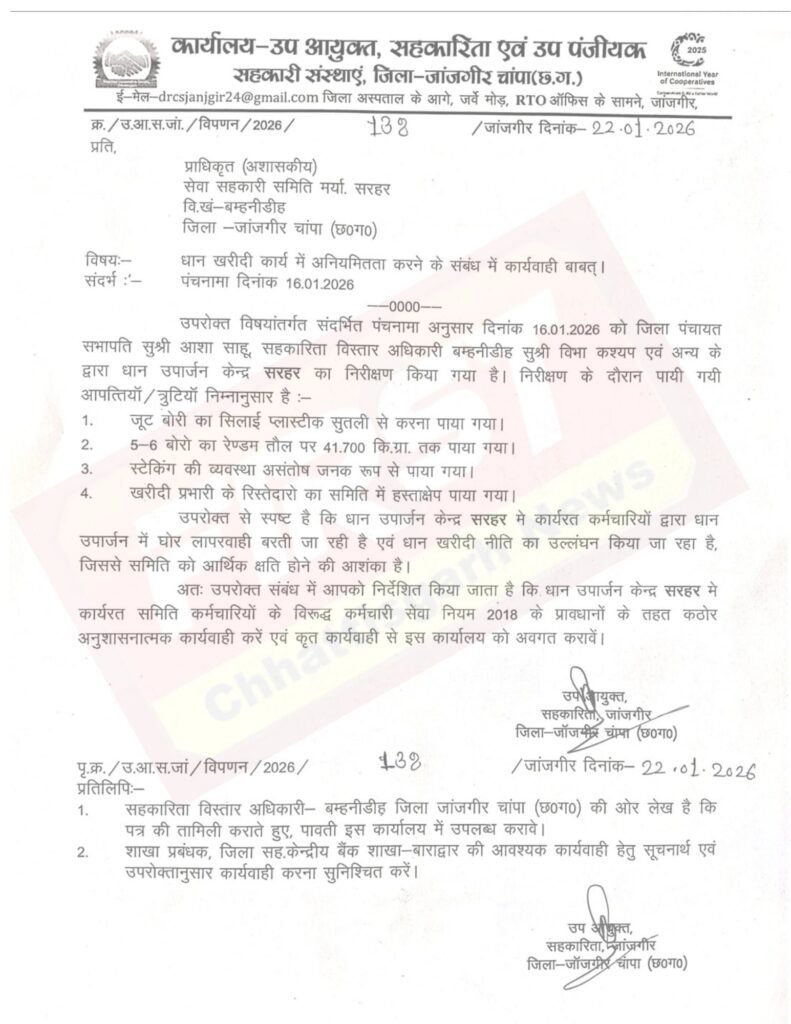 बम्हनीडीह विकासखंड अंतर्गत प्राधिकृत (अशासकीय) सेवा सहकारी समिति मर्यादित सरहर में धान खरीदी कार्य के दौरान गंभीर अनियमितताएं सामने आई हैं। पंचायतनामा दिनांक 16 जनवरी 2026 के अनुसार, जिला पंचायत सभापति सुश्री आशा साहू, सहकारिता विस्तार अधिकारी बम्हनीडीह सुश्री विभा कश्यप एवं अन्य अधिकारियों द्वारा धान उपार्जन केंद्र सरहर का निरीक्षण किया गया।