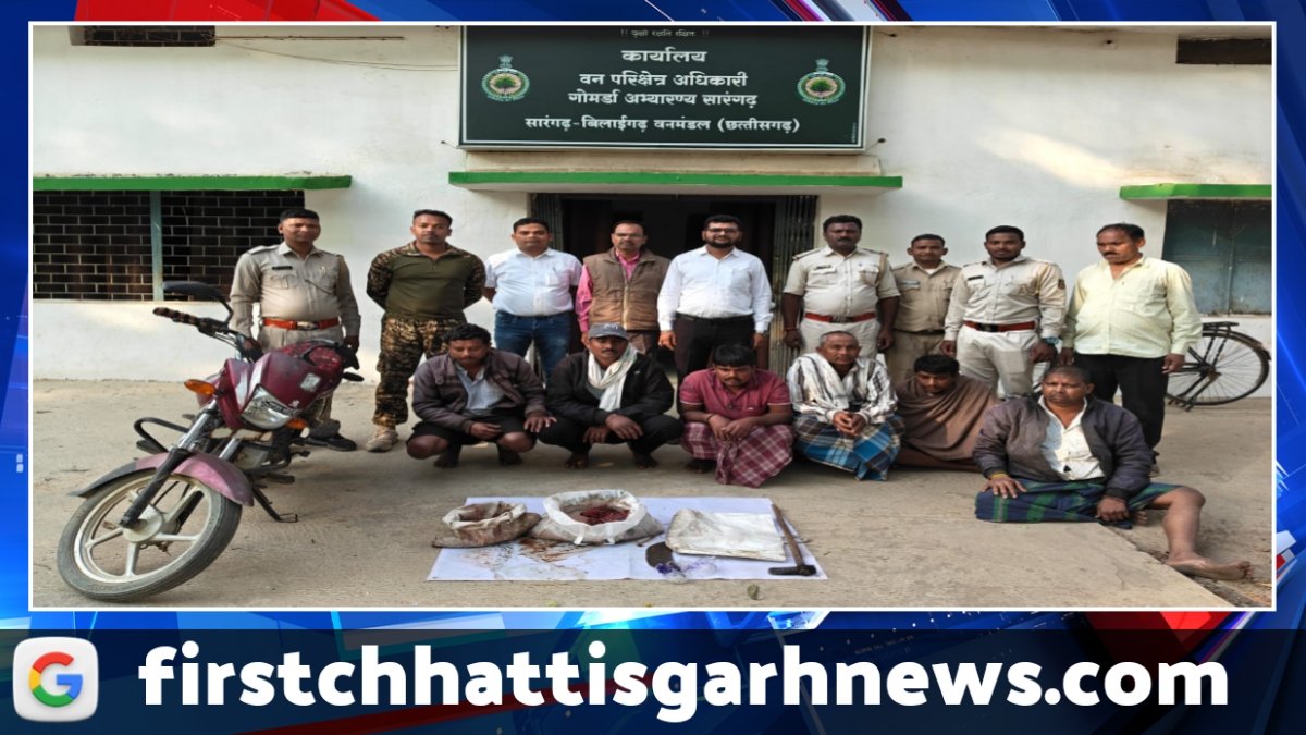 जानकारी के मुताबिक,सारंगढ़ के रेगालमुड़ा गांव क्षेत्र के जंगल मे रेगालमुड़ा के आरोपियों ने जंगल क्षेत्र में साभर का शिकार कर उसका मांस बांटने की तैयारी कर ली थी। मौके से शिकार और शिकार में इस्तेमाल किए गए हथियार, धारदार औजार और वन्यजीव के अवशेष बरामद किए गए हैं। वन विभाग ने सभी आरोपियों के खिलाफ वन्यजीव संरक्षण अधिनियम के तहत मामला दर्ज कर लिया है।