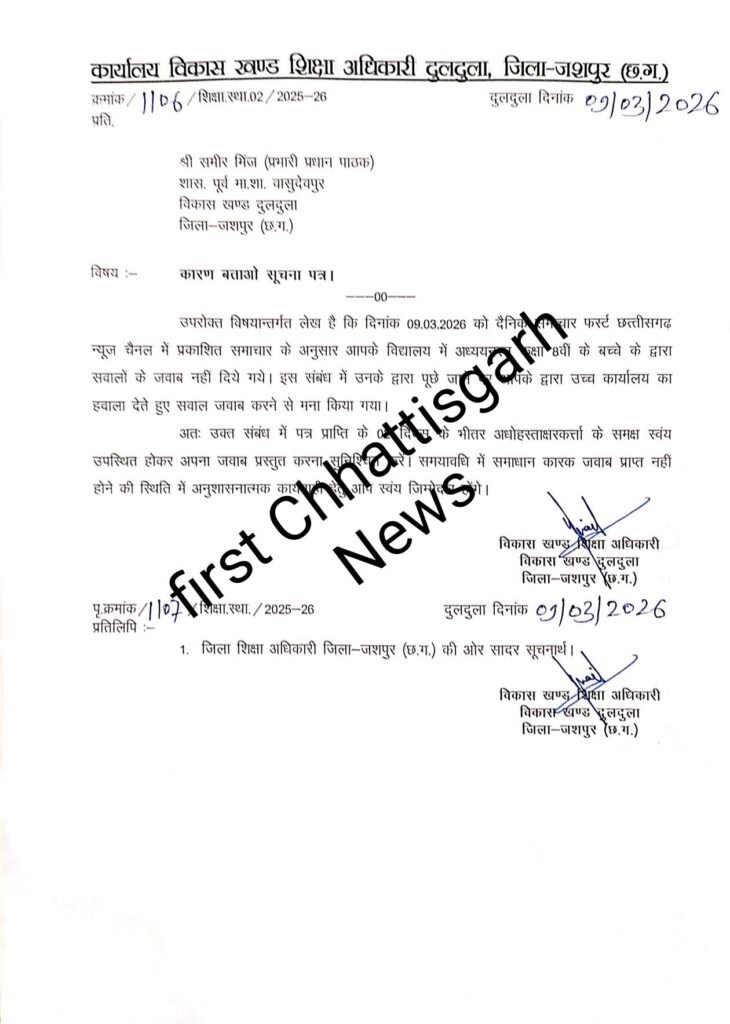 दुलदुला। विकासखंड दुलदुला क्षेत्र के शासकीय पूर्व माध्यमिक शाला वासुदेवपुर में शिक्षा व्यवस्था में लापरवाही की खबर सामने आने के बाद अब विभाग हरकत में आ गया है। मीडिया में मामला उजागर होने के बाद विकासखंड शिक्षा अधिकारी (BEO) ने संबंधित शिक्षक को कारण बताओ नोटिस जारी करते हुए जवाब मांगा है।
