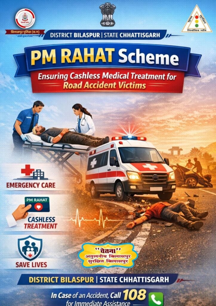 PM-RAHAT योजना: सड़क दुर्घटना पीड़ितों को ₹1.50 लाख तक कैशलेस इलाज बिलासपुर में दुर्घटना पीड़ितों को 7 दिन तक मुफ्त उपचार की सुविधा‘गोल्डन ऑवर’ में इलाज से बचेंगी जानें, PM-RAHAT योजना लागू