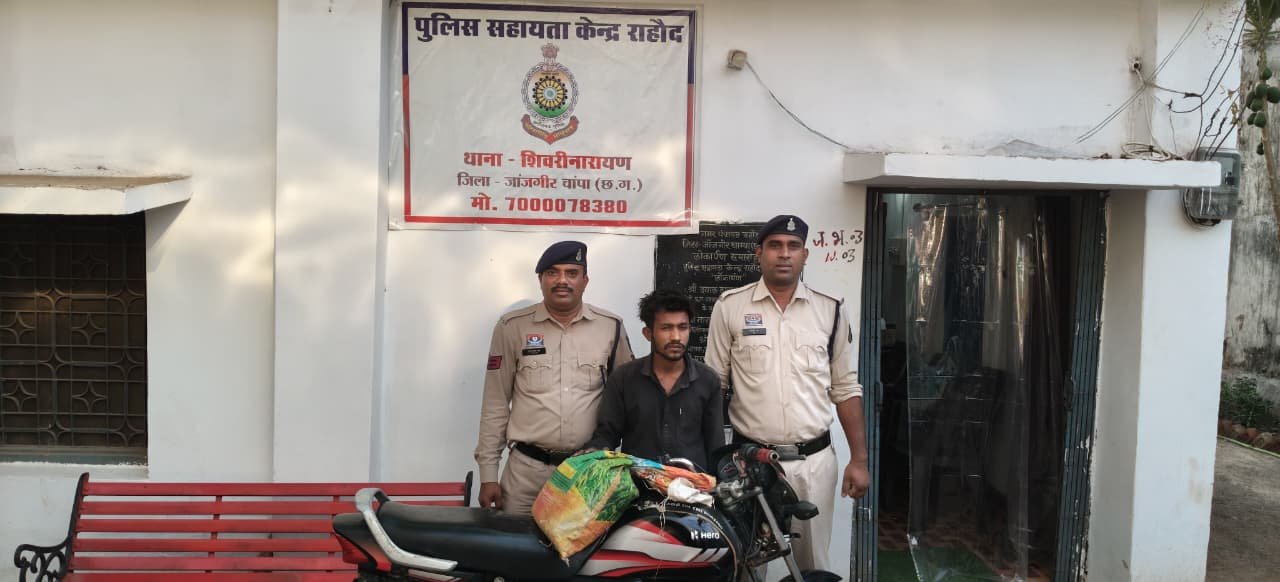 पुलिस से मिली जानकारी के अनुसार, आरोपी किशन कुमार जांगड़े (23 वर्ष), निवासी पेंड्री थाना पामगढ़, मोटरसाइकिल के माध्यम से अवैध महुआ शराब का परिवहन कर रहा था। पुलिस ने कार्रवाई करते हुए उसके कब्जे से कुल 12.600 लीटर कच्ची महुआ शराब, जिसकी अनुमानित कीमत 2600 रुपये है, बरामद की है। साथ ही परिवहन में प्रयुक्त हीरो एचएफ डीलक्स मोटरसाइकिल को भी जब्त किया गया है।