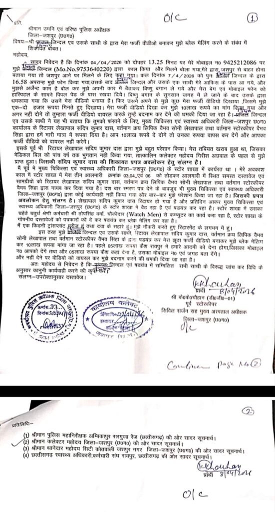 जशपुर। जिले में ब्लैकमेलिंग का एक सनसनीखेज मामला सामने आया है।किशोर कुमार  चौहान (पूर्व स्टोरकीपर, जिला चिकित्सालय जशपुर) ने कुछ लोगों पर फर्जी वीडियो बनाकर ब्लैकमेल करने और 10 लाख रुपये की मांग करने का गंभीर आरोप लगाया है। मामले को लेकर उन्होंने वरिष्ठ पुलिस अधीक्षक को लिखित शिकायत सौंपकर कार्रवाई की मांग की है।