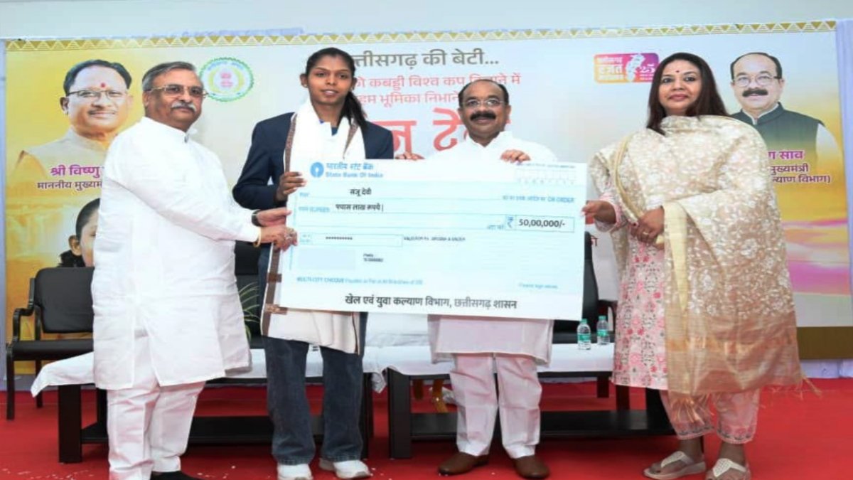 रायपुर में सम्मान: संजू देवी को 50 लाख प्रोत्साहन राशि, उपमुख्यमंत्री अरुण साव ने सौंपा चेक