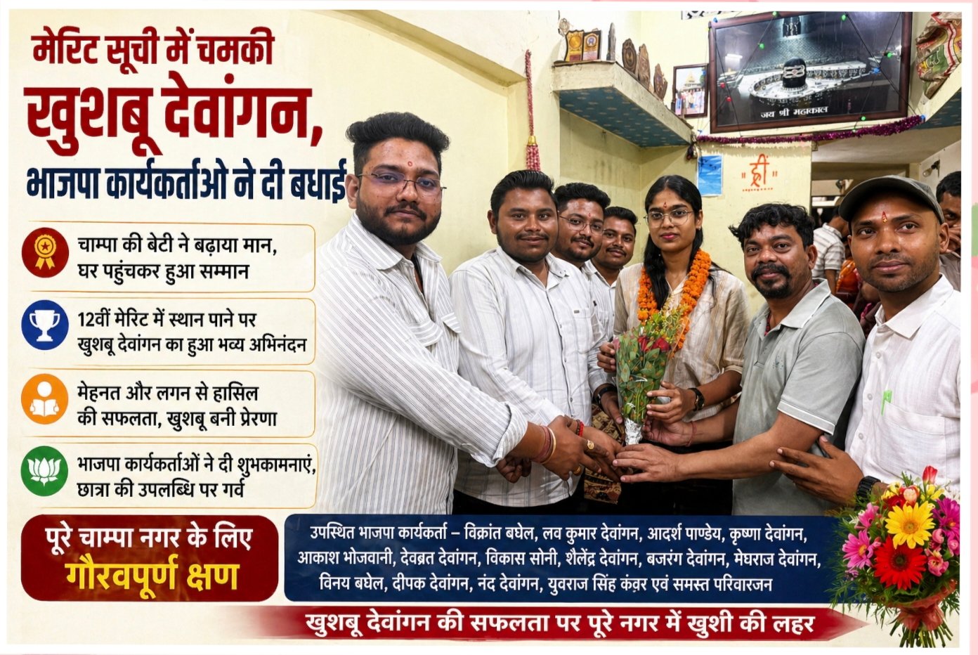 इस दौरान कार्यकर्ताओं ने खुशबू देवांगन की सफलता की सराहना करते हुए कहा कि उन्होंने अपनी मेहनत, लगन और अनुशासन के बल पर न केवल अपने परिवार, बल्कि पूरे चाम्पा नगर का नाम गौरवान्वित किया है। उन्होंने यह भी कहा कि ऐसी प्रतिभाशाली छात्राएं समाज के लिए प्रेरणास्रोत होती हैं और आने वाली पीढ़ियों को आगे बढ़ने की दिशा दिखाती हैं।